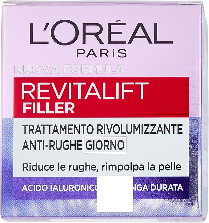 L'Oréal Paris Crema Viso Giorno Revitalift Filler, Per Tutti i Tipi di Pelle, Azione Anti-Rughe, Pelle Rimpolpata a Lungo, con Acido Ialuronico Concentrato, 50 ml