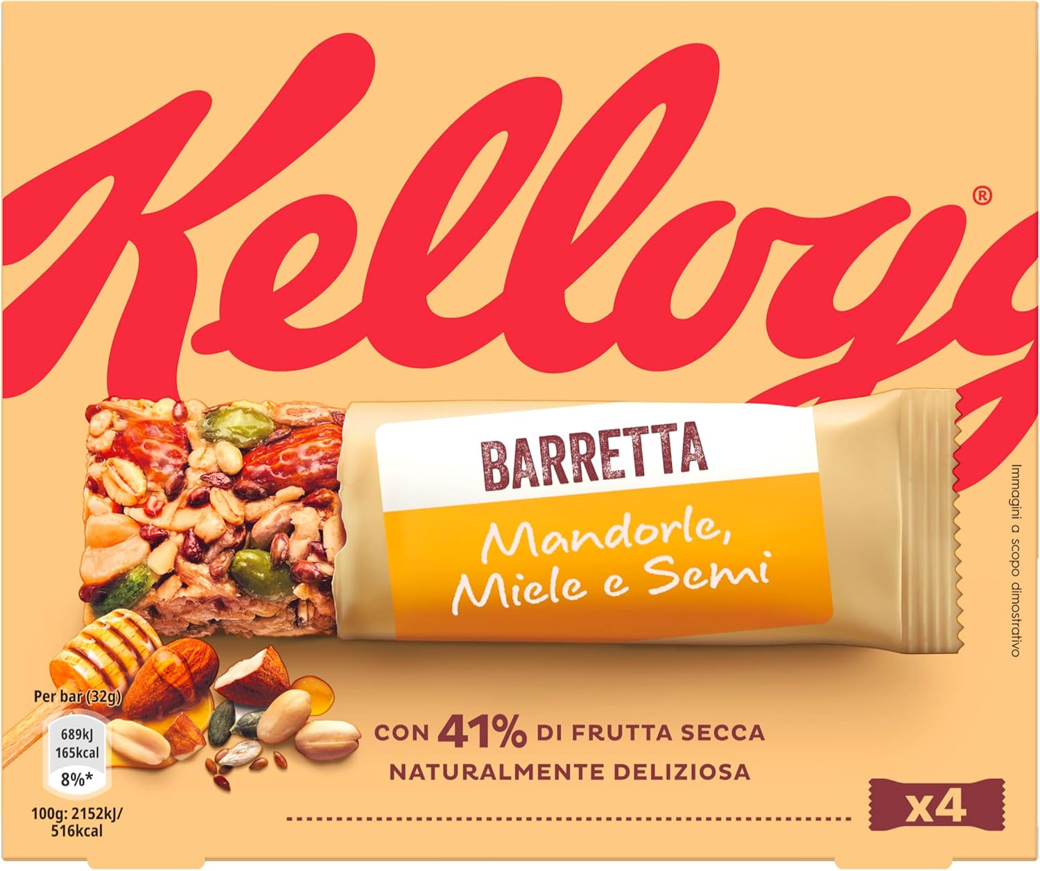 Kellogg's Barretta | Gusto Mandorle, Miele e Semi | Ricca di Fibre e con 41% di Frutta Secca | 4 barrette da 32g (Confezione da 128g)
