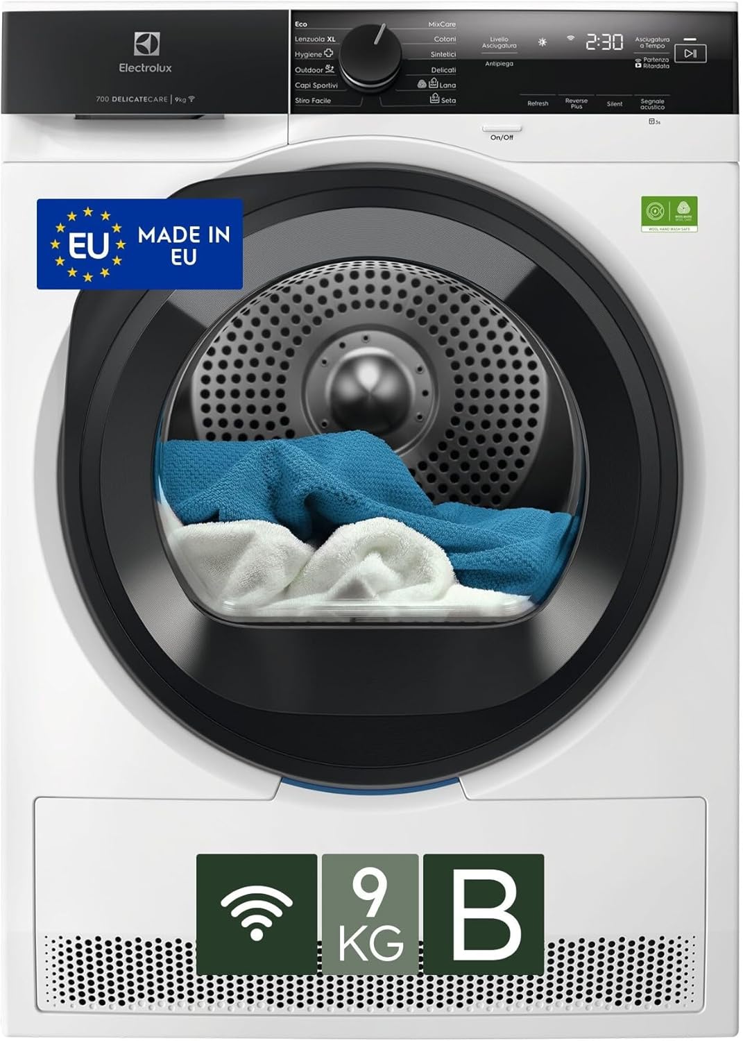 📌 L'asciugatrice DelicateCare asciuga delicatamente lana e seta, evita restringimenti e offre connettività smart per controllo remoto. Il programma MixCare garantisce asciugatura uniforme per tutti i tessuti e il ciclo Hygiene elimina il 99.9% di virus e batteri.