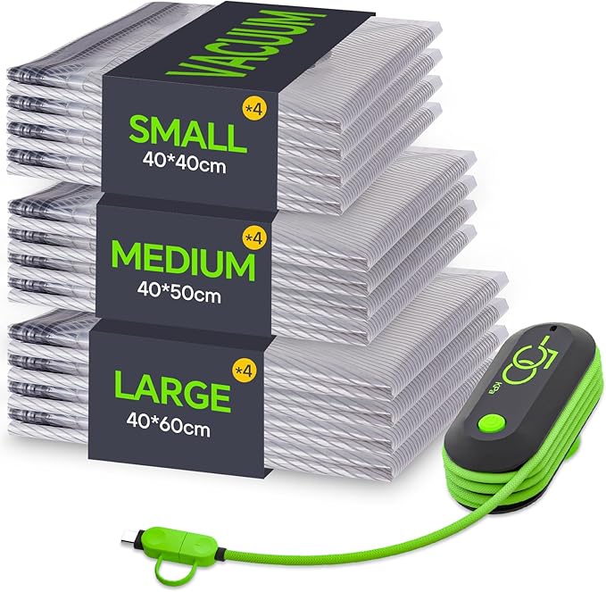 Vacbird Sacchetti Sottovuoto Vestiti Viaggio con Pompa USB, Set di 12 Buste Sottovuoto Vestiti Riutilizzabili, Durata Sacchetti Sottovuoto da Viaggio - Essenziali per Viaggio Salvaspazio