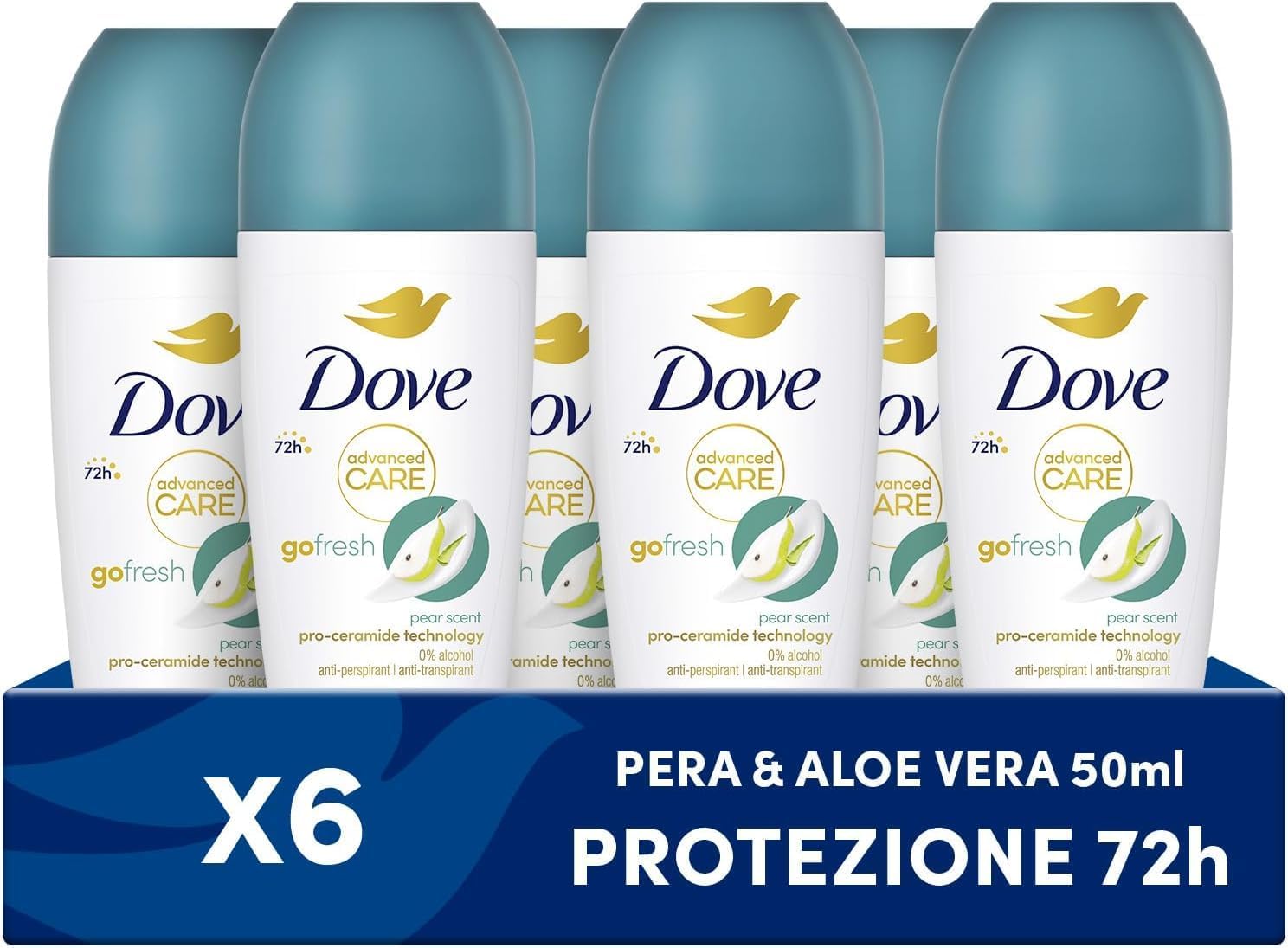 Dove, Deodorante Roll On Advanced Care Pera e Aloe, Deodorante Antitraspirante, Formula Delicata Con Tripla Azione Idratante, Protezione Fino a 48 Ore, Deodorante Uomo e Donna, 6 Pezzi da 50 ml