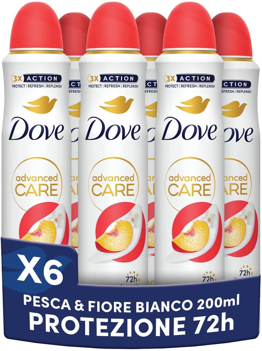 Dove Deodorante Spray Advanced Care Go Fresh Pesca, con Formula Idratante e Delicata sulla Pelle, Senza Alcol, Pelle Asciutta Fino a 72 Ore, Deodorante Uomo e Donna, 6 Pezzi da 200ml