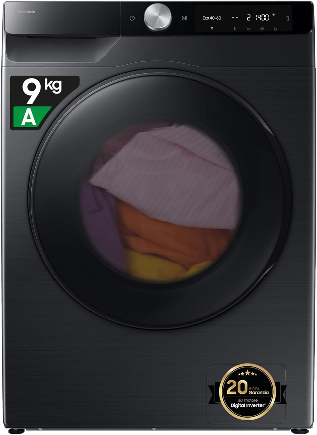 📌 Lavasciuga frontale da 9/5 kg con WiFi, lavaggio a vapore e centrifuga 1400rpm. Include cassetto Ecodosatore, AI Energy Mode per il risparmio energetico, Air Wash per eliminare odori e batteri, e SmartThings per monitoraggio consumi. Dimensioni: 60x85x48 cm.