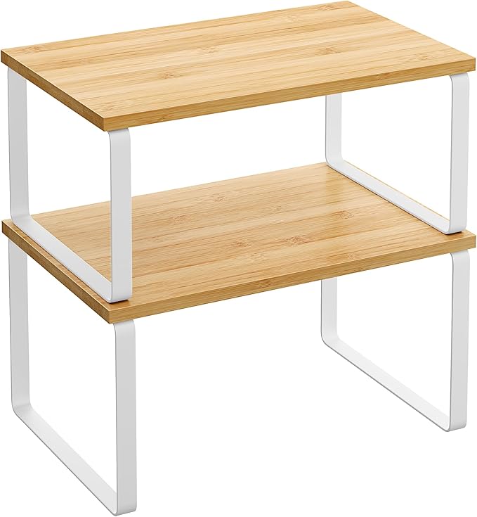 SONGMICS Scaffale Portaspezie, Set di 2 Organizzatori da Cucina Espandibili, Scaffale da Cucina Impilabile, Metallo e Legno Ingegnerizzato, Bianco Nuvola e Beige Naturale KCS02NW