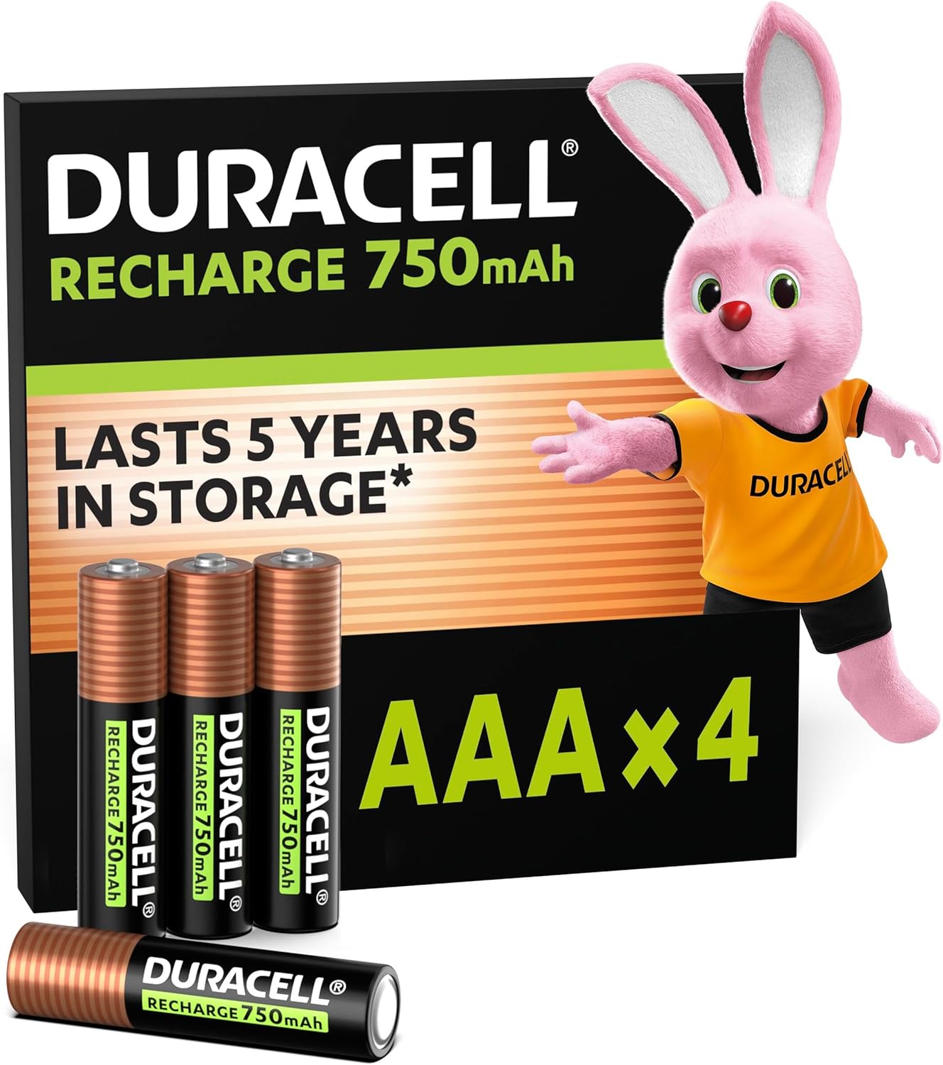 Duracell Batterie Ricaricabili AAA (Confezione da 4), Pile ricaricabili, 750 mAh NiMH, 1000 ricariche, pre-caricate, energia di lunga durata con una confezione plastic free e 100% riciclabile