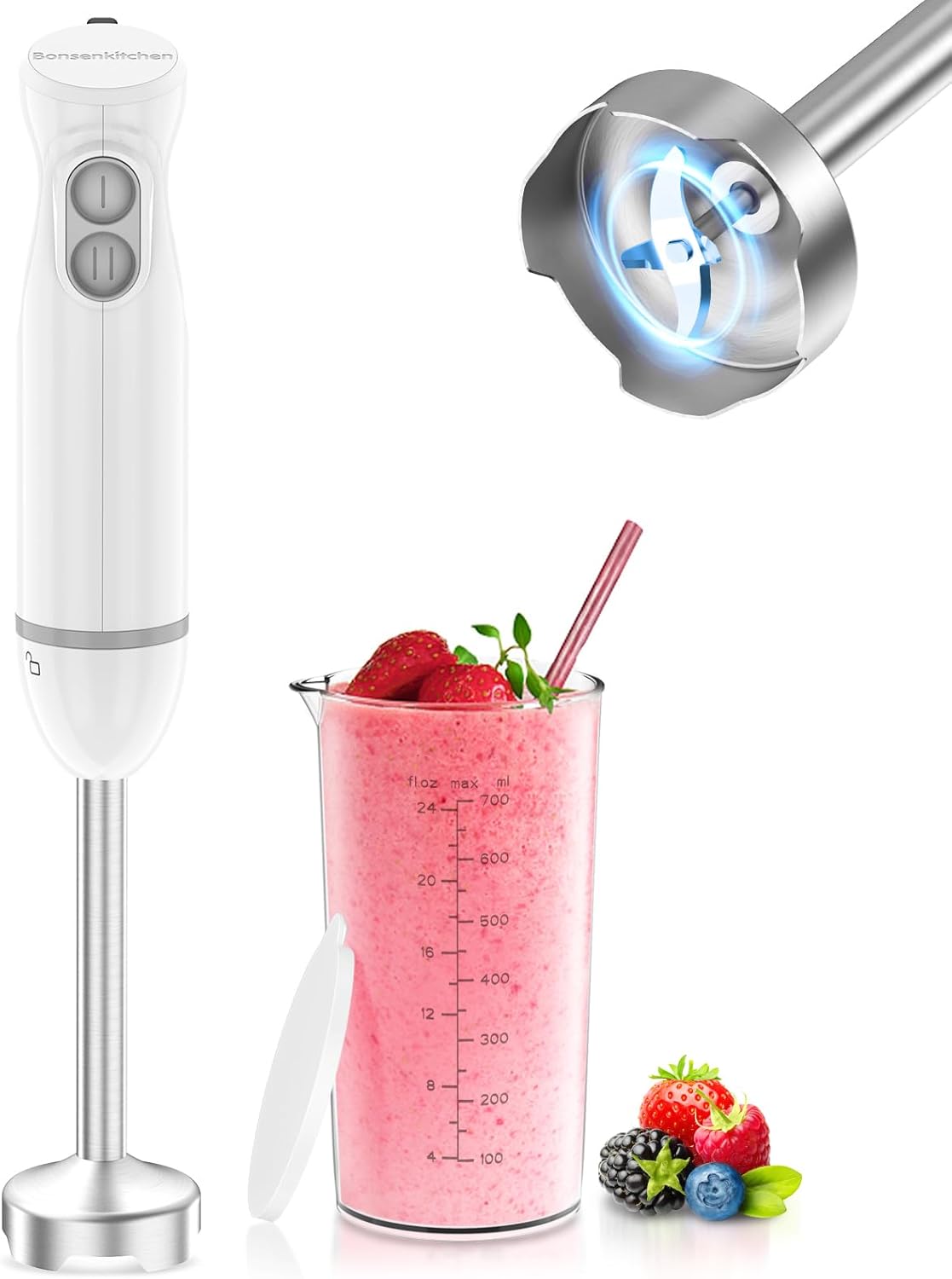 Bonsenkitchen Frullatore a Immersione 2 in 1, 1000 W, Frullatore in acciaio inox, 2 Velocità, con Misurino da 700 ml con Coperchio, per Pappe, Zuppe, Frullati, Puree