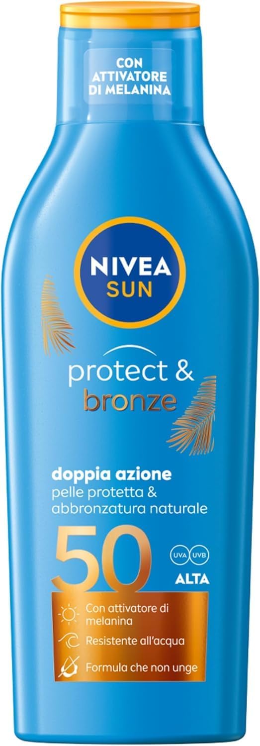 NIVEA SUN Latte Solare Protect & Bronze FP 50 200 ml, Crema solare 50 per un'abbronzatura dorata, intensa e uniforme, Protezione solare 50 con attivatore di melanina